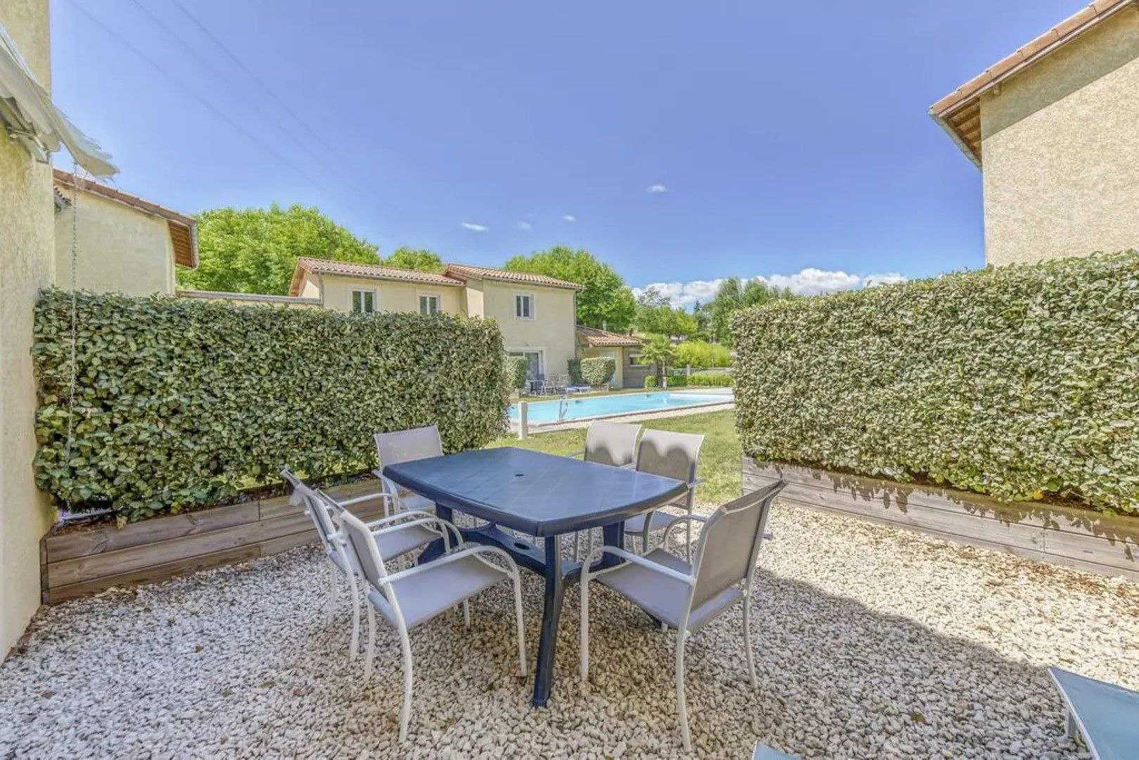 Dit is het huisje 3 met privé terras en publiek zwembad.