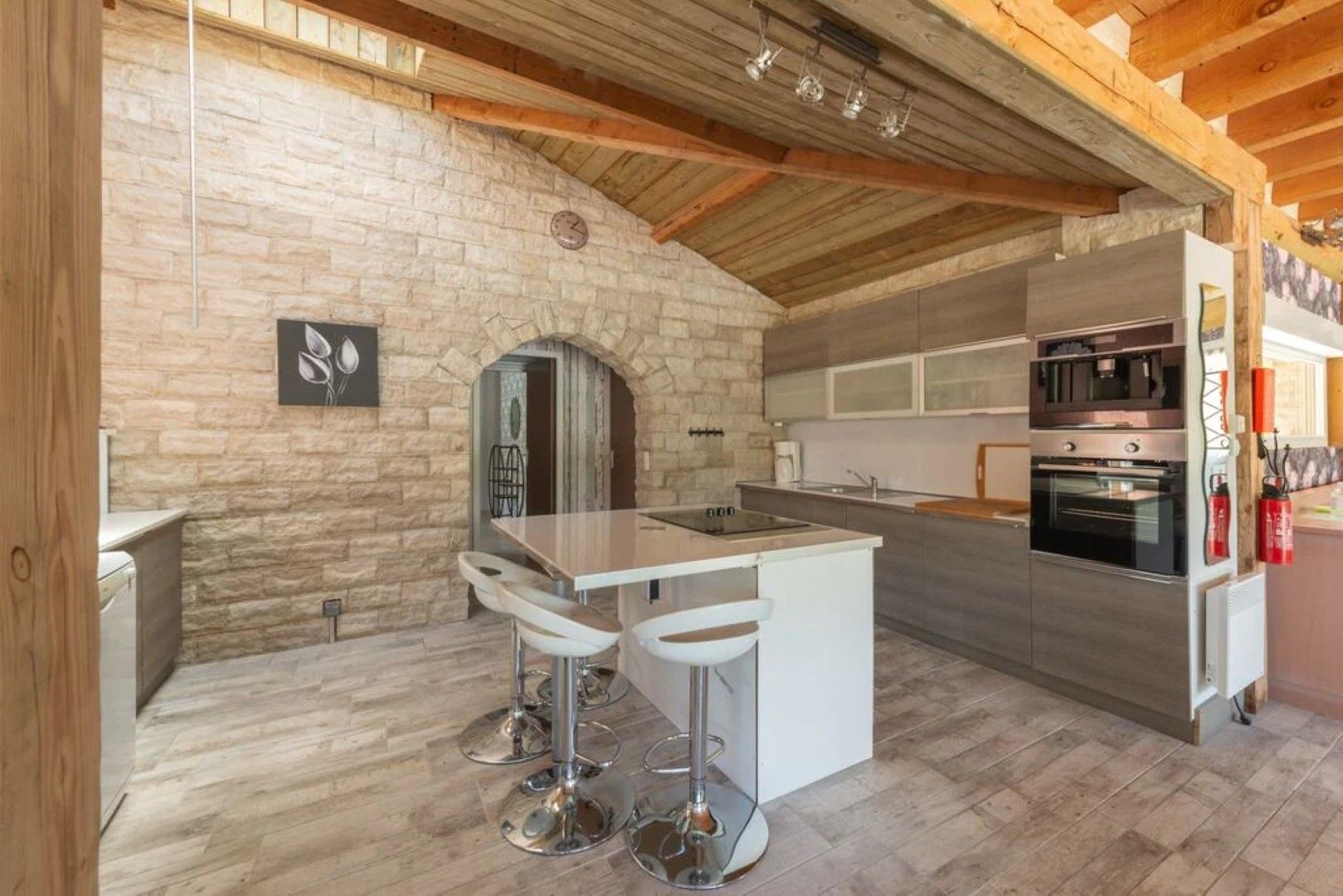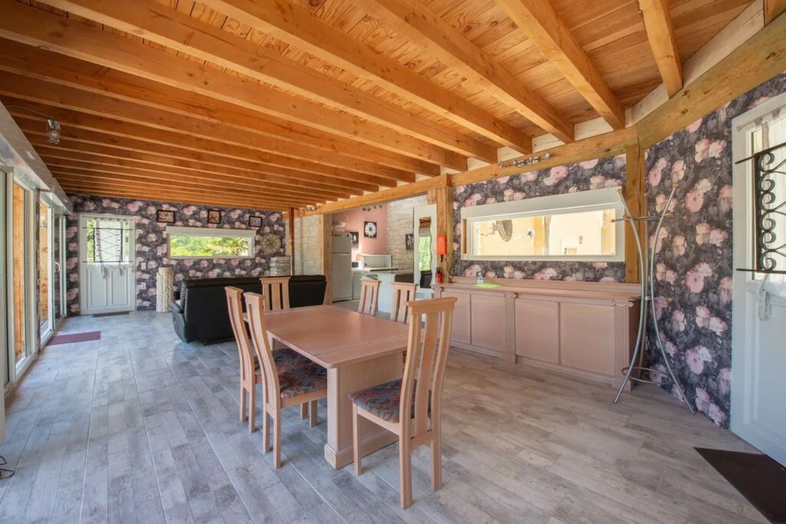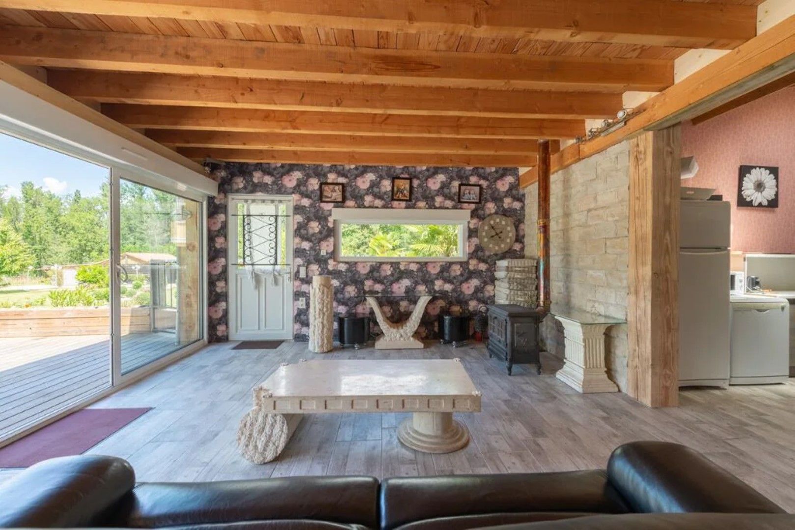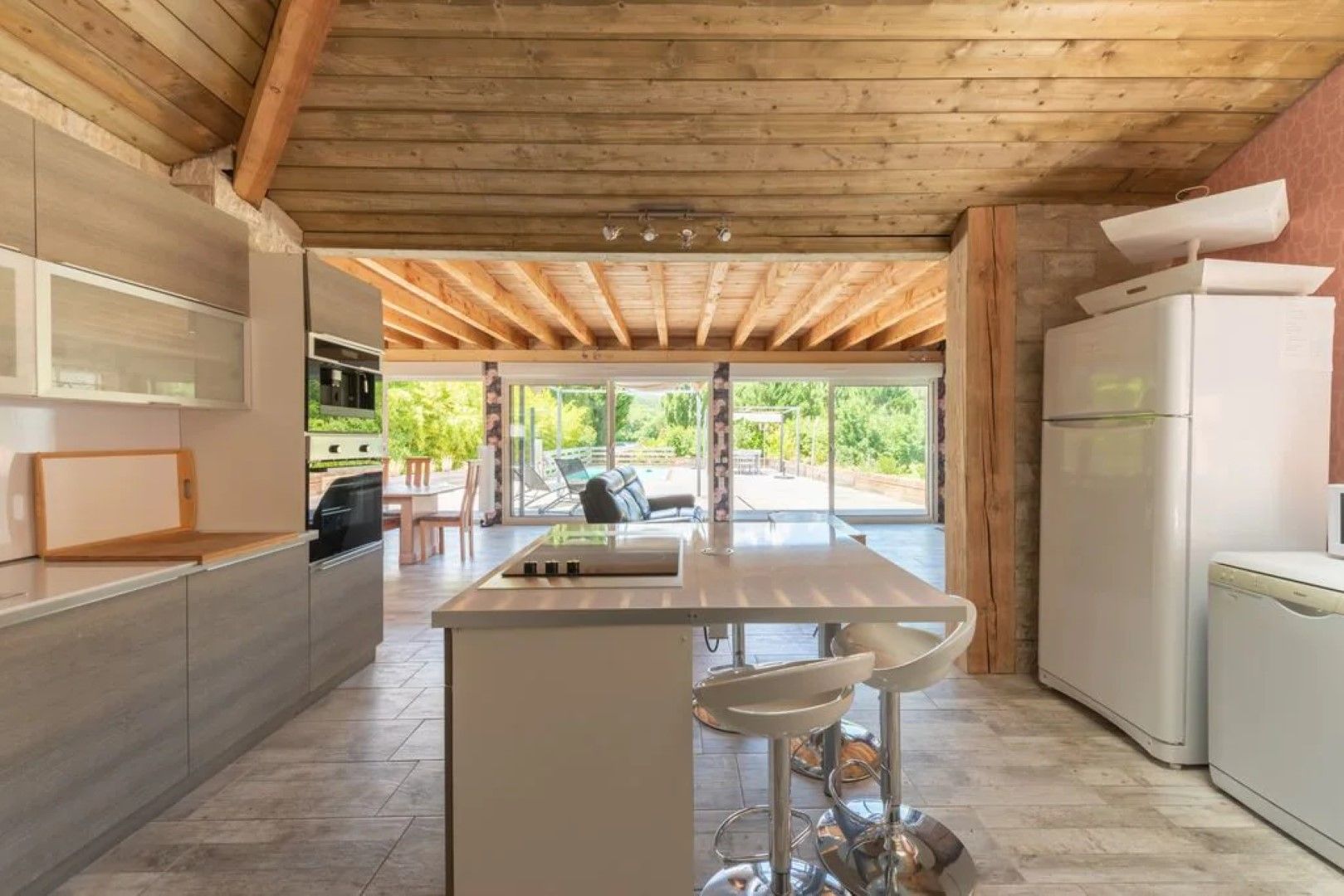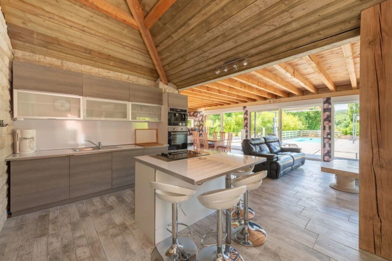 Ruime living en open keuken met kookeiland.